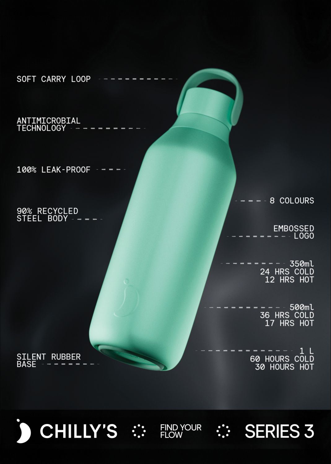 Chilly's Series 3-flessen zijn gemaakt van hoogwaardig roestvrij staal met een gepoedercoate buitenkant. De nieuwe kraag rond de hals van de fles is gemaakt van plastic verrijkt met een BioCote-additief.