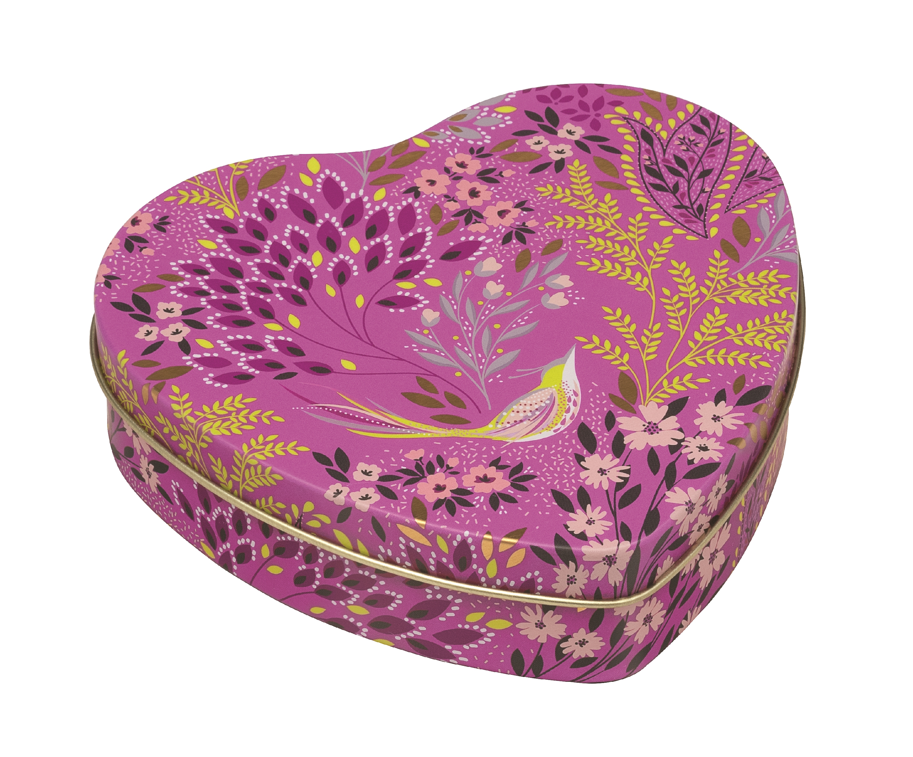 Paars bewaarblik met een sierlijke vogel en blaadjes in een vorm van een hartje.