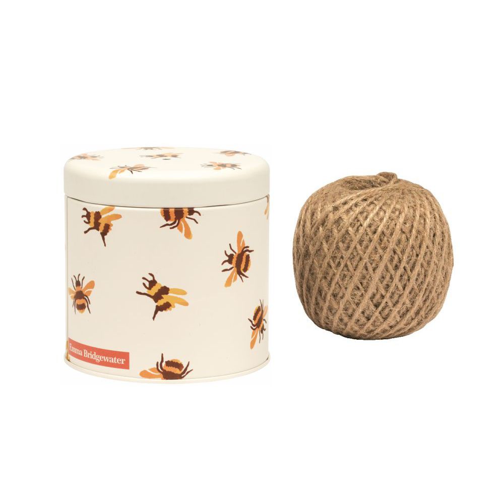Emma Bridgewater blikje met de bijen (Bumblebees). Wat heel handig is bij dit blikje er zit een gaatje in de deksel waar door je touw gemakkelijk kunt afrollen en doorknippen.