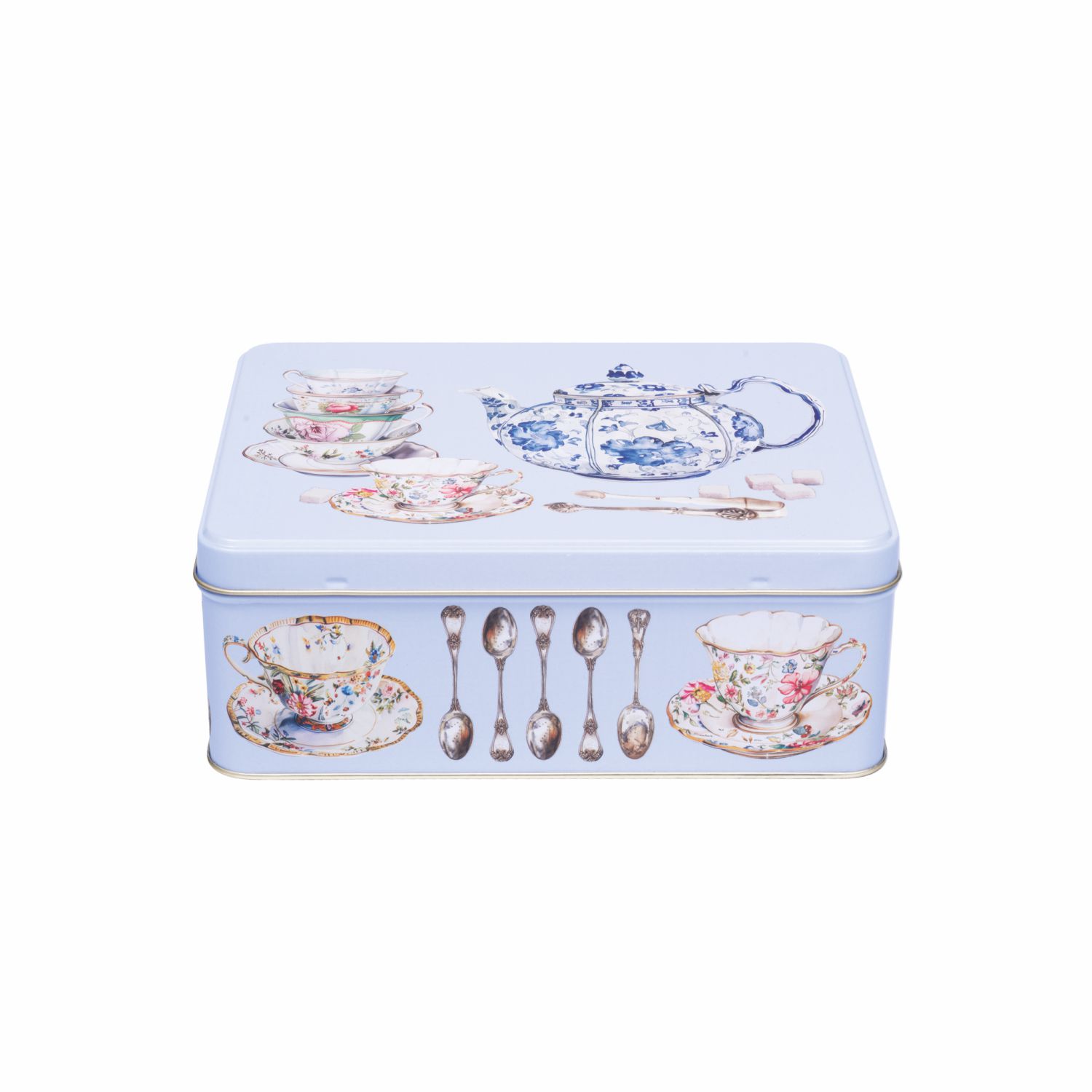 Bewaarblik met theekopjes en theepotjes. Ideaal voor koekjes.